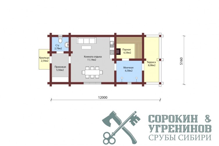 Сруб бани рубленый из бревна кедра диаметра 240мм площадью 55,5м2. Размер сруба 5,1х12 метров по осям. Планировка бани, парная, душевая, комната отдыха, санузел, терраса с одной стороны и крыльцо с другой противоположной стороны. Сруб рубленый вручную в русскую чашу (охлоп), брёвна окоренные гидро-окоркой (водой под высоким давлением), а так, же это можно сделать скобелем или лопатой, или строганное рубанком. Объем бревна в срубе 40м3.